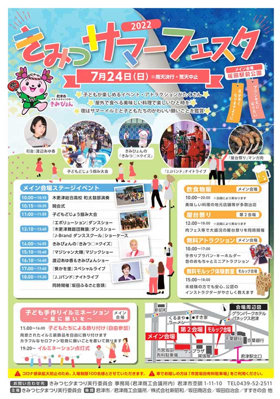 きみつサマーフェスタ 開催日:2022年7月24日(日) 会場:坂田駅前公園(メインステージ) └君津駅北口の尾張屋駐車場斜め前・市営駐車場隣の公園です ダンスステージ:12:10〜予定 主催:きみつ七夕まつり実行委員会 ※雨天決行・荒天中止