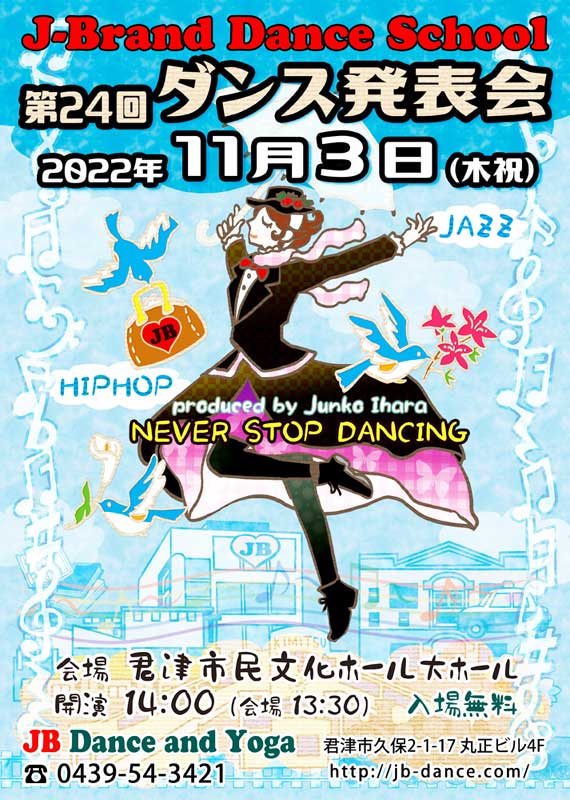 J-Brand Dance School第24回ダンス発表会 開催日:2022年11月3日(木祝) 会場 :君津市民文化ホール 大ホール 時間 :開場13:30 開演14:00 入場無料