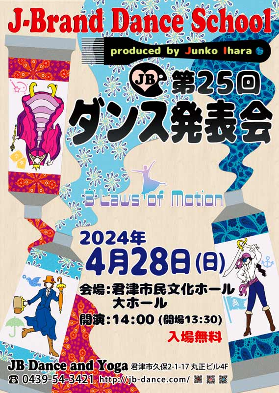 J-Brand Dance School第25回ダンス発表会 3 Laws of Motion 開催日:2024年4月28日(日) 会場 :君津市民文化ホール 大ホール 時間 :開演14:00(開場13:30) 入場無料